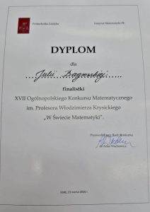 Julia Bagrowska, uczennica klasy 3A została finalistką XVII Ogólnopolskiego Konkursu Matematycznego “W Świecie Matematyki” im. Profesora Włodzimierza Krysickiego organizowanego przez Politechnikę Łódzką, który odbył się 13 marca w Instytucie Matematyki Politechniki Łódzkiej. W konkursie wzięło udział kilkudziesięciu uczniów szkół ponadpodstawowych z całej Polski.